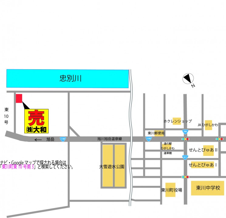 | 交通機関 | 旭川電気軌道「東10号」バス停留所から徒歩6分 | 学区 | 東川第三小学校、東川中学校 |
